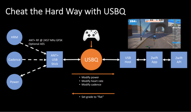 The hack uses software, hardware and a Xbox controller to exploit vulnerabilities in the USB ANT+ sensors providing heart rate, power and cadence data to Zwift.