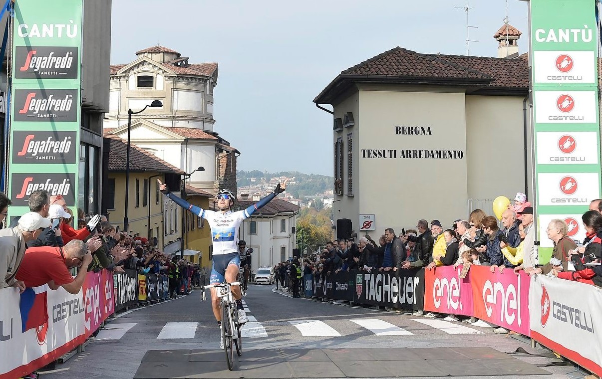 The 112km route with numerous ups and downs, including the mythical climb to Madonna del Ghisallo above Lake Como and the Muro di Sormano with its 27% grade, gradually weeded out competitors before they returned to the start/finish in Cantù.