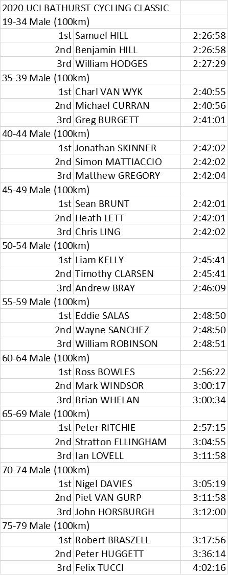 Below are results for the UCI Bathurst Classic Gran Fondo. Riders finishing in the top 20% of their UCI age group qualify for the Gran Fondo World Championships scheduled later this year in Canada.