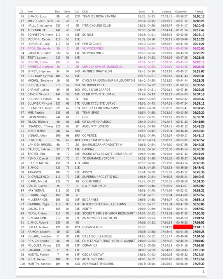 Annalisa Prato (Team Colpack Master) won the women’s gran fondo race in 5:32, finishing 21st overall.