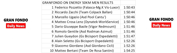 Riccardo Zacchi was second, Marcello Ugazio third and Matteo Crosa fourth. Guest of honor Davide Rebellin was the last member of the breakaway, but out of contention as a former professional.