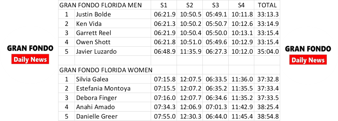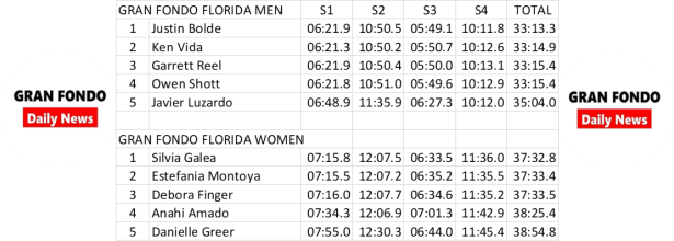 Justine Bold took home the “Fastest in Florida” title, completing all four sectors in 33:13.27 at an average speed just under 30mph (29.35mph to be exact). Right behind was Ken Vida at 33:14.87 and Garret Reel at 33:15.37.