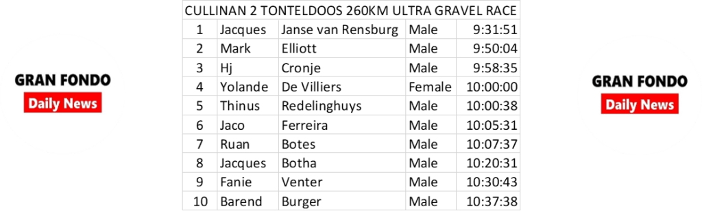 This year ex-professional road racer and South African National Champion Jacques Janse van Rensburg won the 260km race in 9:31:51 with an eighteen minute lead over Mark Elliott. Hj Cronje was third in 9:58:35 followed quickly by the Women’s category champion Yolande De Villiers, who at 48 years-old finished in 10:00:00.