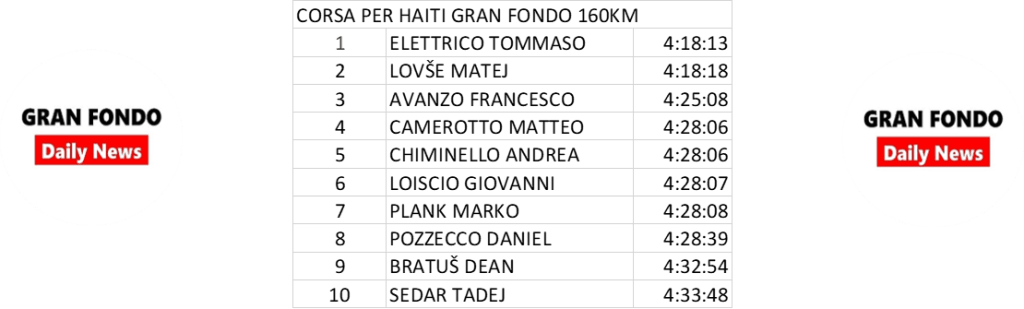 Gran Fondo World Champion Thomaso Elettrico traveled 160 kilometres through northeast Italy in 4:18:13 to earn victory, followed by World Amateur Time Trial Champion Matej Lovše from Solvenia in 4:18:17 and then Francesco Avanzo in 4:25:07.