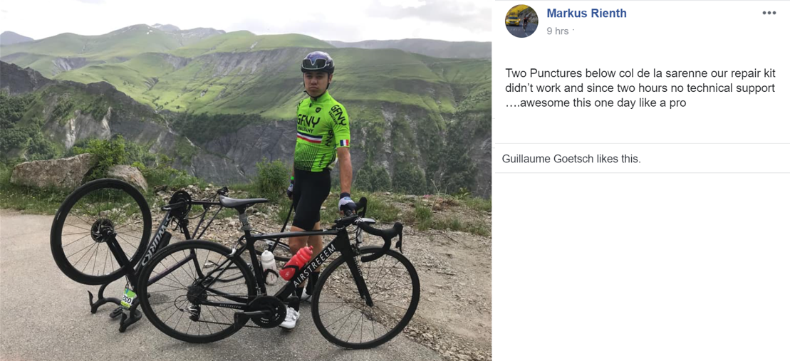 It was after climbing Alpe d’Huez on the 150 metre ascent of Col de la Sarenne that GFNY La Vaujany rider Marcus Rienth punctured. It was not a good day for Marcus, and it was about to get a lot worse. The puncture was his second on the day and unfortunately, his spare tube and repair kit did not fix the tire.
