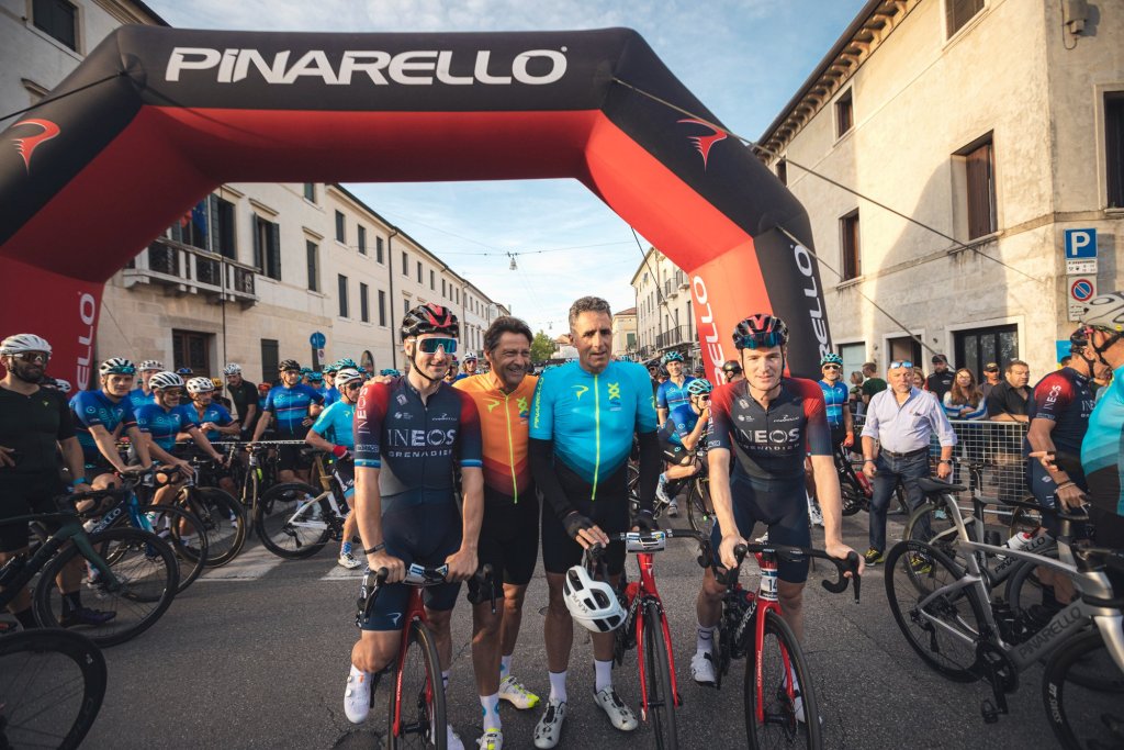 Lining up in front of the starting corral to lead the peloton out of the city was Miguel Indurain, winner of five Tour de France titles aboard Pinarello built bikes, and two stars of Team Ineos – Elia Viviani and Salvatore Puccio.