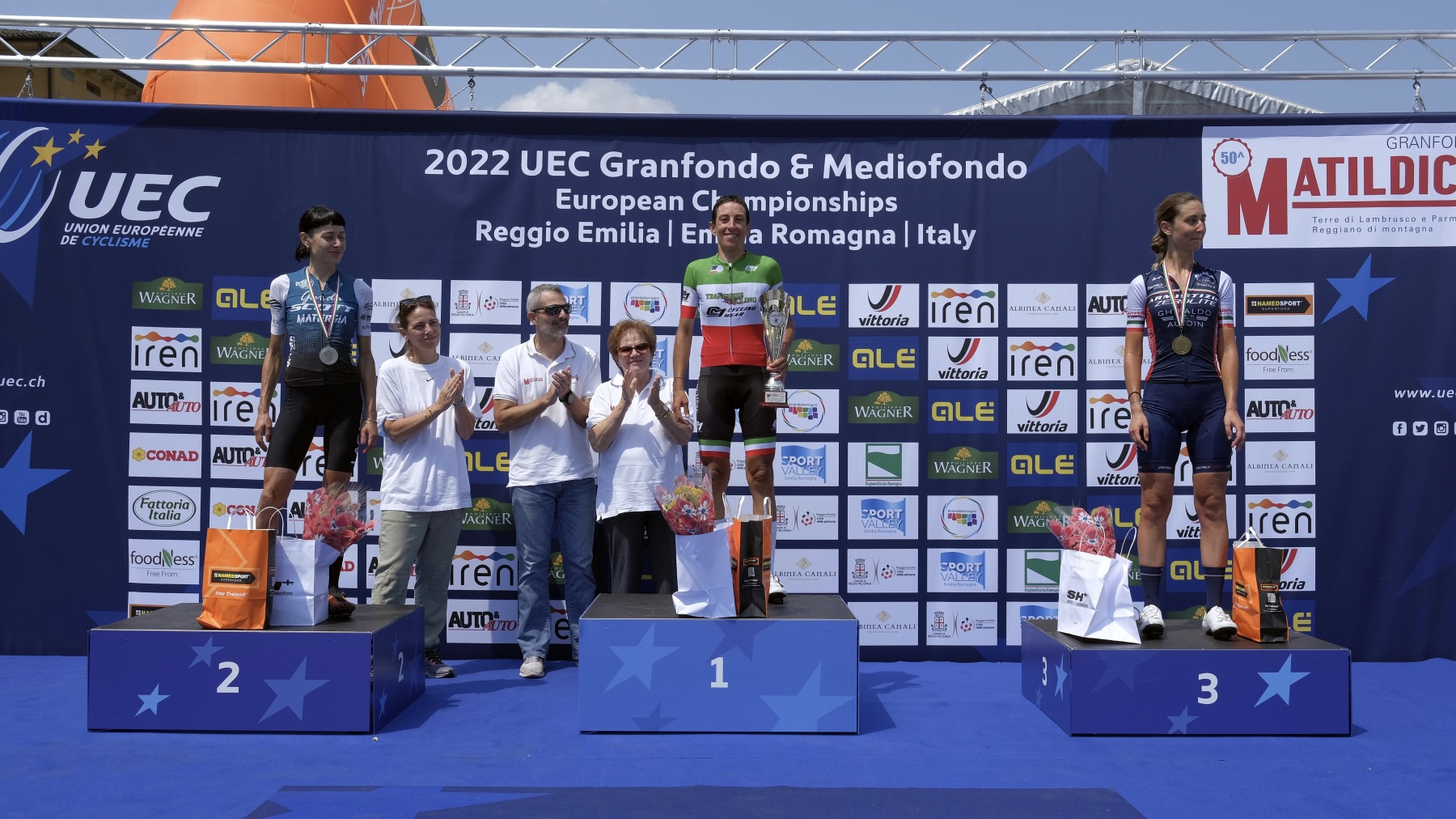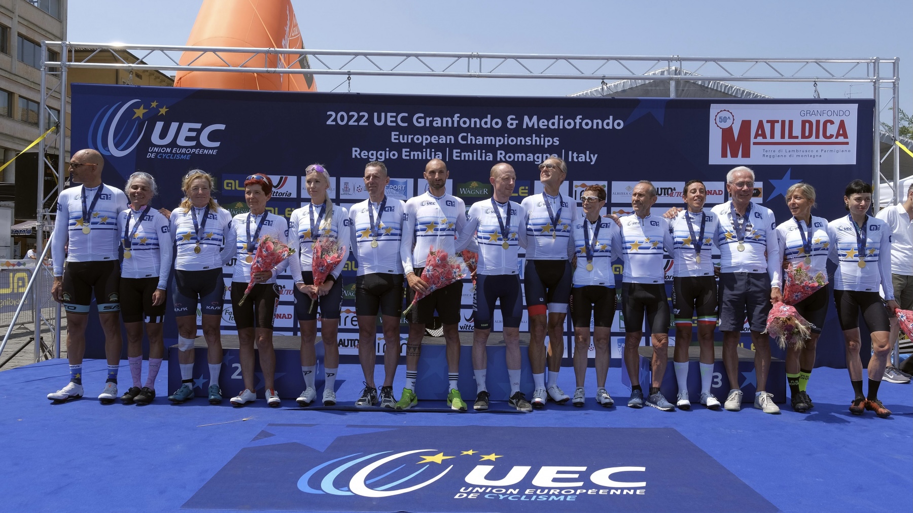 UEC Granfondo and Mediofondo championship jerseys and gold medals were also awarded by standard 10-year age/gender categories.