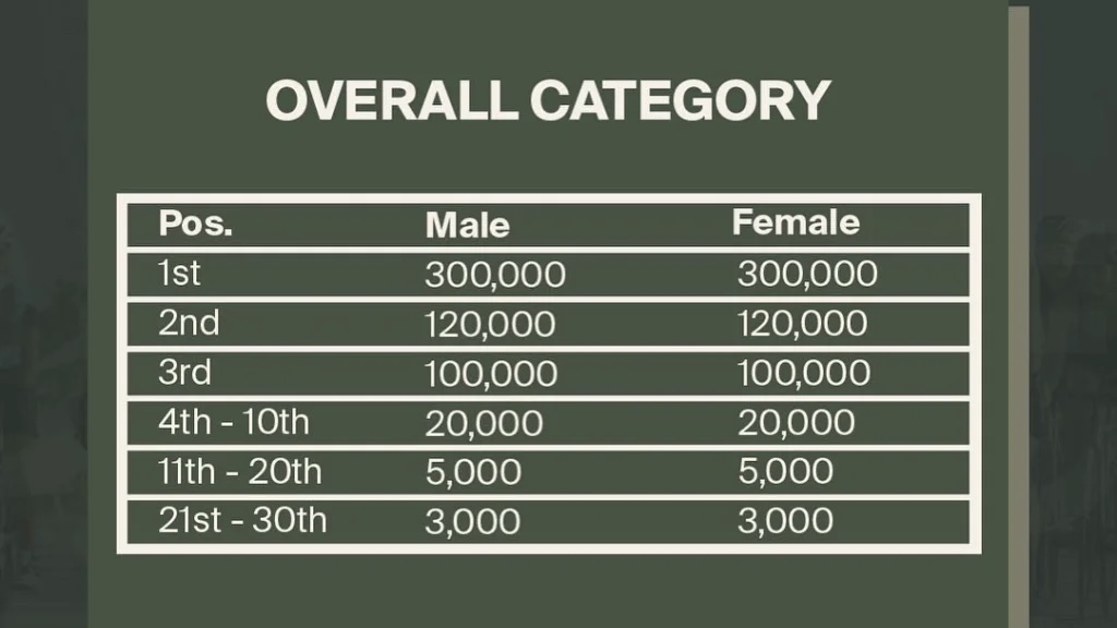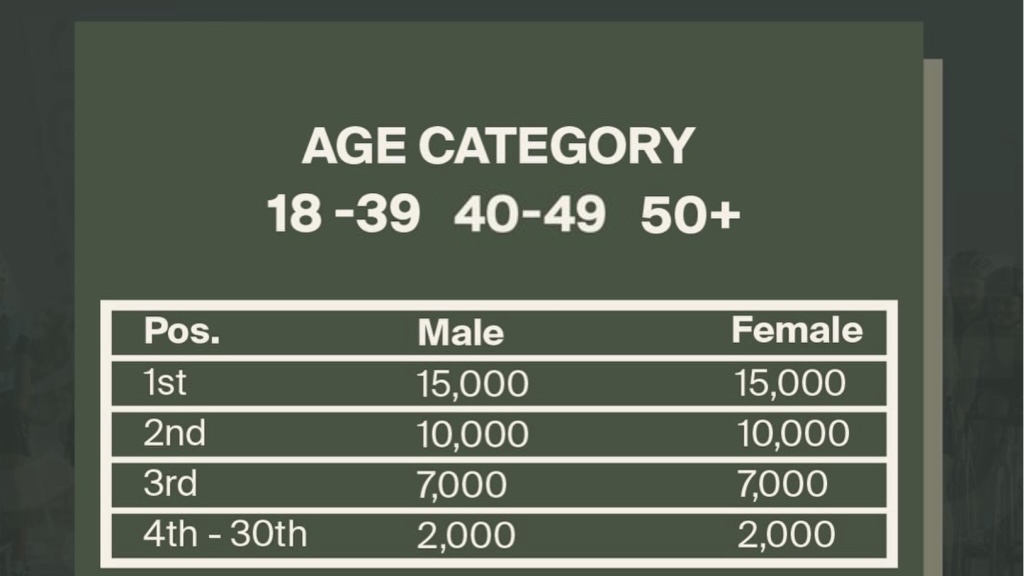 Payouts will be equal for women and men, with each overall winner taking home AED 300,000, while the rest of the age group category winners will enjoy an AED 15,000 prize. Even 30th place will earn AED 2000, about ten times the cost of entry.