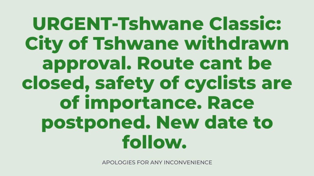 Thousands of amateur cyclists woke up Sunday morning ready to race 99 kilometers on closed roads in Pretoria, South Afrika at the Tshwane Classic gran fondo. Soon they were left disillusioned after receiving a 03:00 text message indication the event was cancelled because things were quite “hectic at Hectic Promotions (the organizer), since they apparently did not have the City of Pretoria’s full support to hold the race on closed roads as advertised.