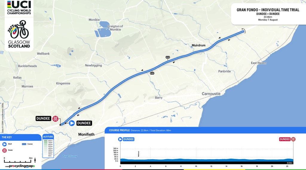 Three days after neighboring Perth hosts the 2023 UCI Gran Fondo World Championship Road Races, the amateur time trial competition is expected to take place Monday 7 August on a very fast, flat and smooth 22.8 kilometers long route, with only 89 meters of elevation gain. The races will start and finish just to the east of the Dundee and complete a flat out-and-back run to Muirdrum.