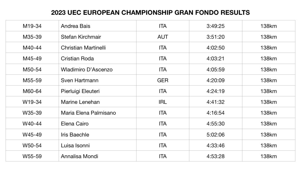 Italian Andrea Bais (Team Sildom Garda) won the overall gran fondo and was crowned UEC European Champion in the men’s 19-34 category with a finishing time of 3:49:25. Fellow Italian Maria Elena Palmisano won the women’s overall gran fondo, as well as the 35-39 UEC title, with a final time of 4:16:54.