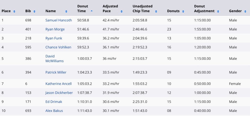 At the finish, a double glazed and confused Morge (51:46) lost by less than a minute to Hancoth (50:58), with both weird-doughs tired of the hole thing and avoiding press with a “donut disturb” attitude.