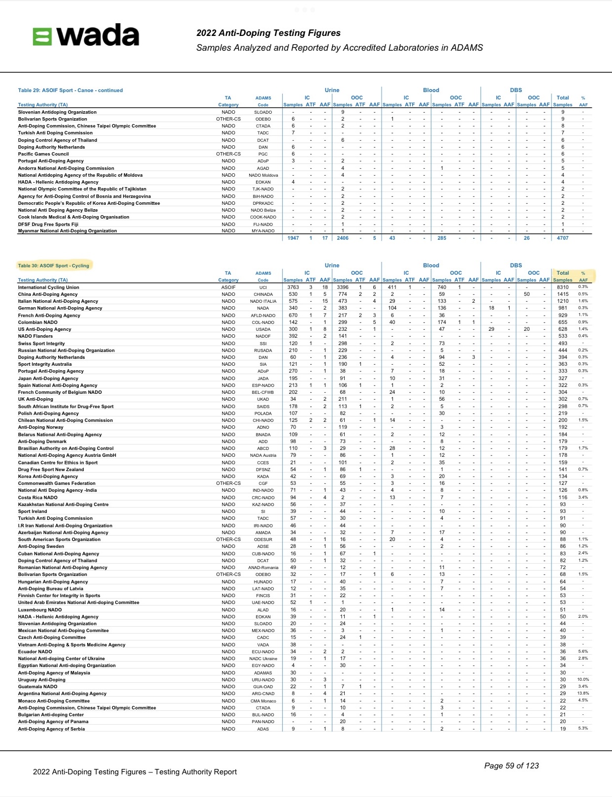 Although the International Cycling Union collected and tested the most anti-doping samples (8,310 primarily from the professional peloton), the rate of positivity was very, very low at 0.03%.