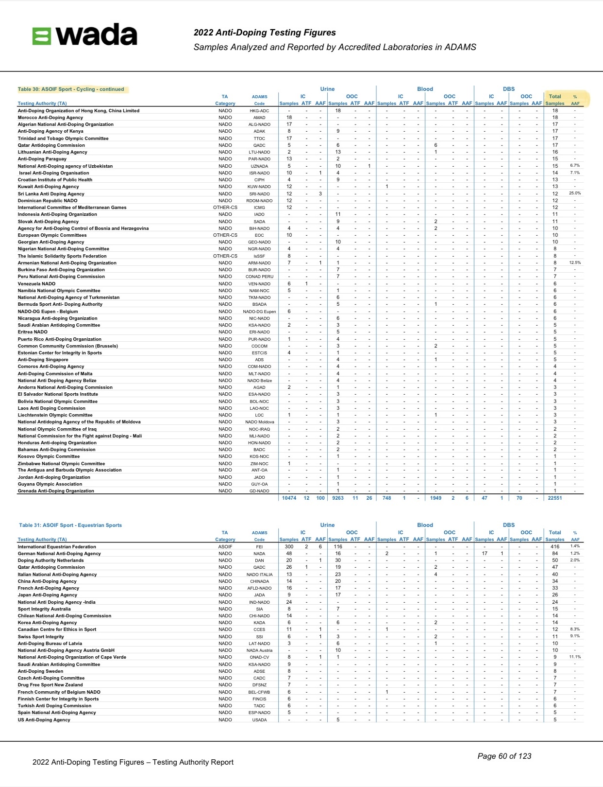 In total for the year, 22,551 anti-doping samples were collected worldwide from cyclists by National Anti-Doping Agencies, with an average positivity rate of 0.05%.