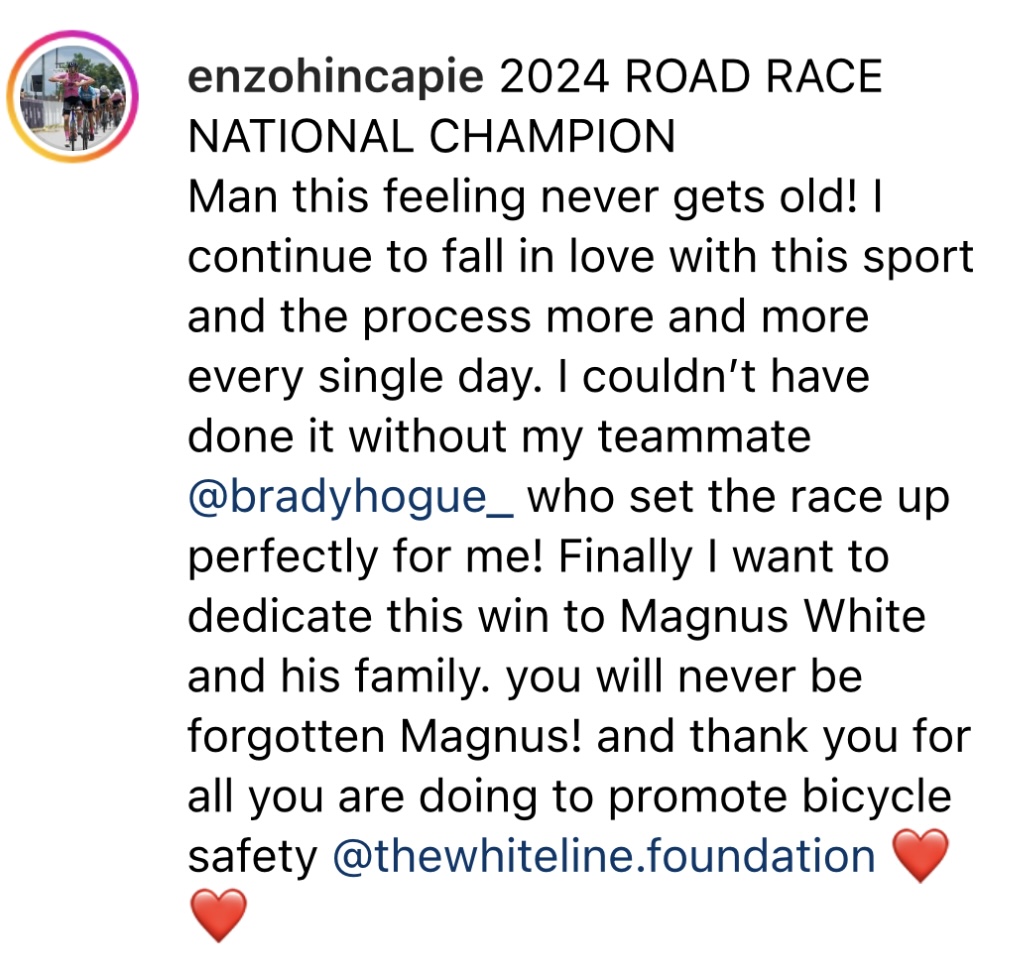 The previous day Enzo also claimed a national title in the 15.9km Individual Time Trial, finishing in 20:01 with an average speed of 47.62 km/h. Rowan Child placed second in 20:11 and Brady Hogue third in 20:32.