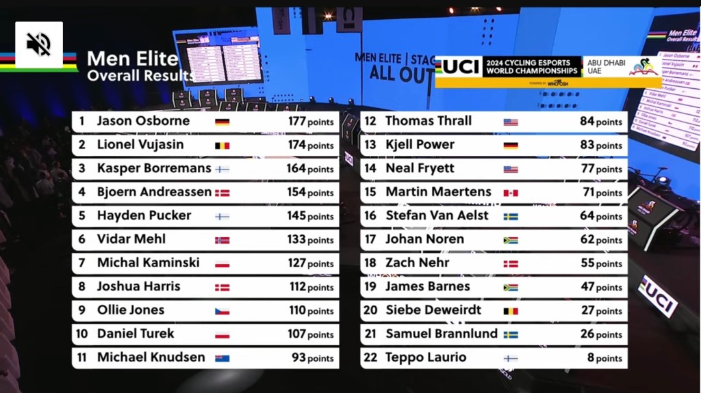 Alpecin-Deceuninck pro Jason Osborne of Germany won the Men’s 2024 UCI Cycling Esports World Championship with an powerful attack in the final race, earning stage victory and enough points to take the rainbow jersey from Lionel Vujasin of Belgium. Osborne’s final point tally was 177, with Vujasin at 174 to take the silver medal and Kasper Borremans of Finland at 164 to earn bronze. Bjoern Andreassen of Denmark and the USA’s Hayden Pucker were fourth and fifth from an field of 22 rides.