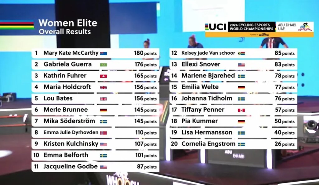 The in-person live 2024 UCI Cycling Esports World Championships took place in Abu Dhabi, UAE on Saturday, with New Zealand’s Kate McCarthy and Germany’s Jason Osborne both crowned 2024 UCI Cycling Esports World Champions.
