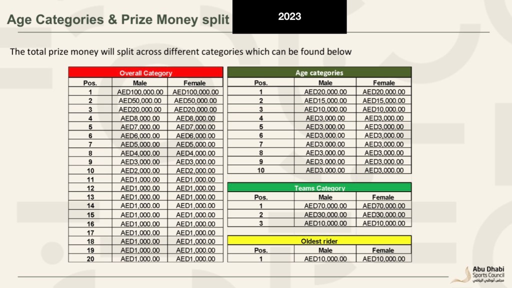 In 2023 over 1200 riders from 75 nations participated, with competitors racing on a dead-flat 150 kilometer point-to-point route from Abu Dhabi to Al Ain, with the winning time about 3:22:00 at an average speed close to 47km/h.