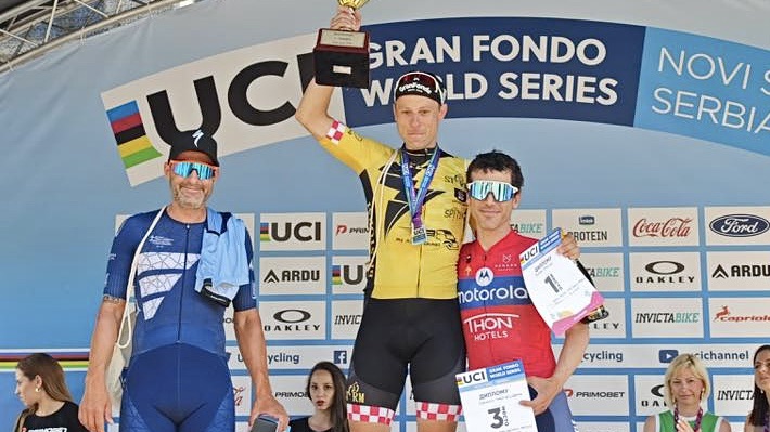 He won the 100 kilometer long UCI Gran Fondo World Championship qualifying race in 2:43:11 with an average speed of 36.8 k/hr. Alexandros Baxevanos of Greece and Eduardo Maretinez Llarena of Spain lead the chasers across the line 3 seconds later.