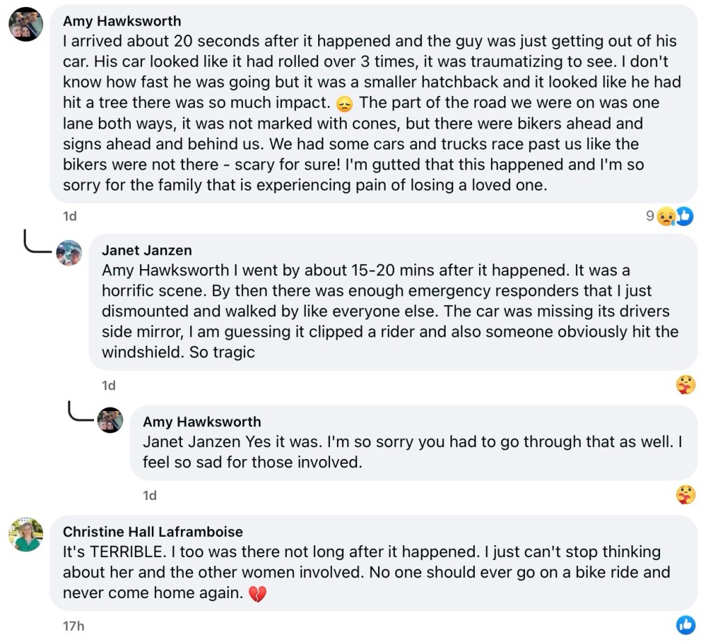 Two other granfondo riders were transported to hospital after sustaining life threatening injuries in the crash. One of them, Karen Martens who qualified for the 2019 and 2021 UCI Gran Fondo World Championships, has a Go Fund Me to help with the cost of recovering from serious internal injuries, a broken arm, knee damage as well as lacerations.