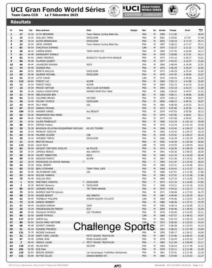 2025 Guadalupe Time Trial Champion Benjamin Le Ny (TEAM MADRAS CYCLING BELLE EAU) showcased his mountain goat form by dropping breakaway companions on the day’s major climb to win solo and qualify for the worlds in 3:11:05. The 26 year-old defeated Excelsior teammates Taino Cailliau 3:19:02 and Alexis Bernagaud 3:28:19 in that order. Le Ny’s teammate Damien Urcel placed fourth.
